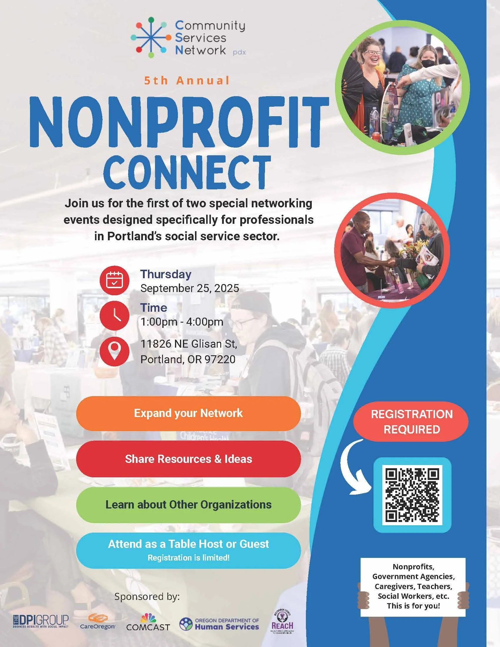 Forge meaningful relationships and deepen your understanding of the nonprofit community at CSN’s Nonprofit Connect 2025. Join us on Thursday, September 25, 2025, from 1:00 PM to 4:00 PM at ODHS, located at 11826 NE Glisan St, Portland, OR 97220, for an afternoon dedicated to connection and collaboration. This is your opportunity to connect with peers, explore the innovative work of local organizations, and discover why collaboration is the key to building a stronger, more unified service community.