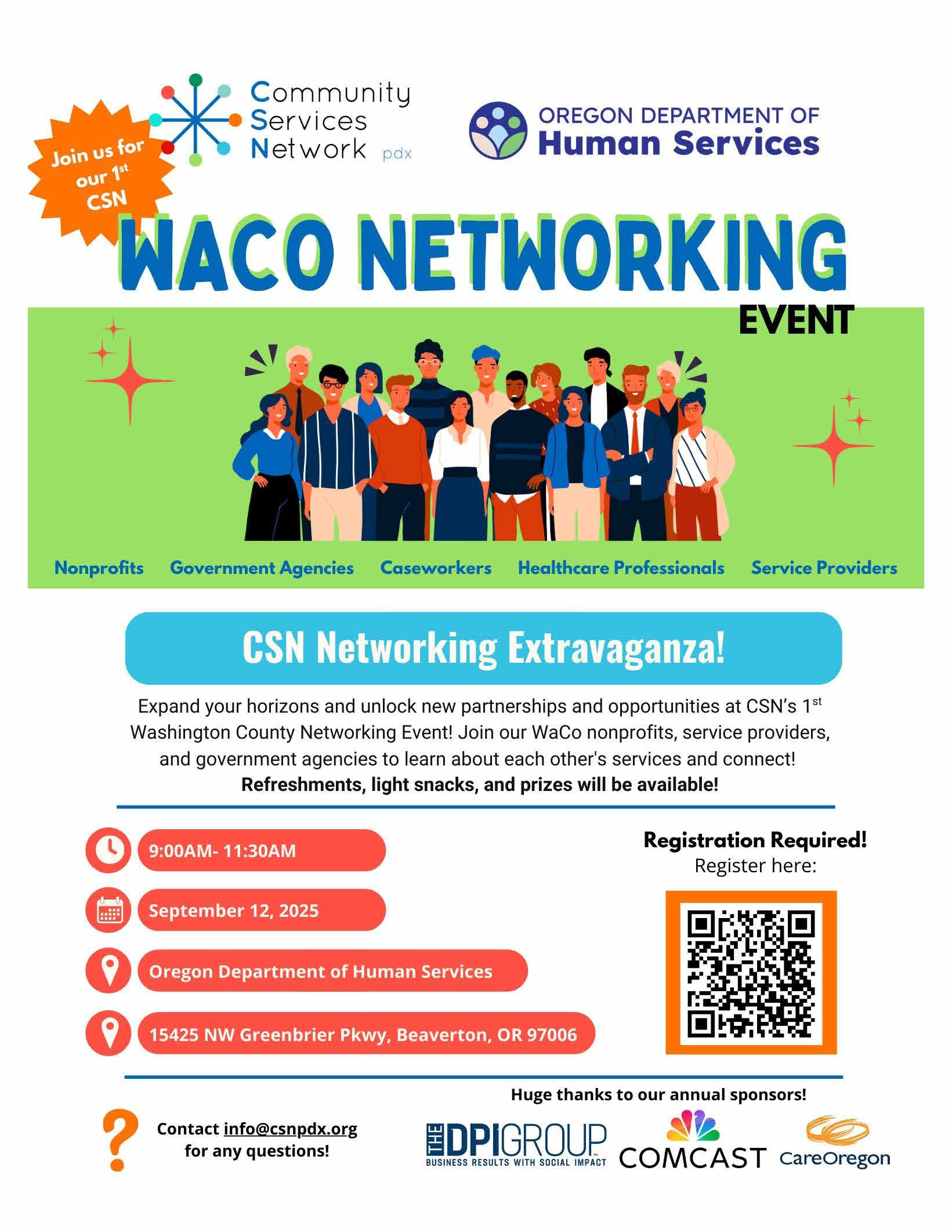 Join us Friday, September 12 from 9am-11:30am for our 1st Washington County Networking Event and connect with social service and nonprofit colleagues, partners, and friends who work to strengthen our communities. This will be a great opportunity to learn about CSN's expansion, resource-share, network, and explore future collaborations with other organizations in Washington County! We have some engaging activities planned- hope to see you there!