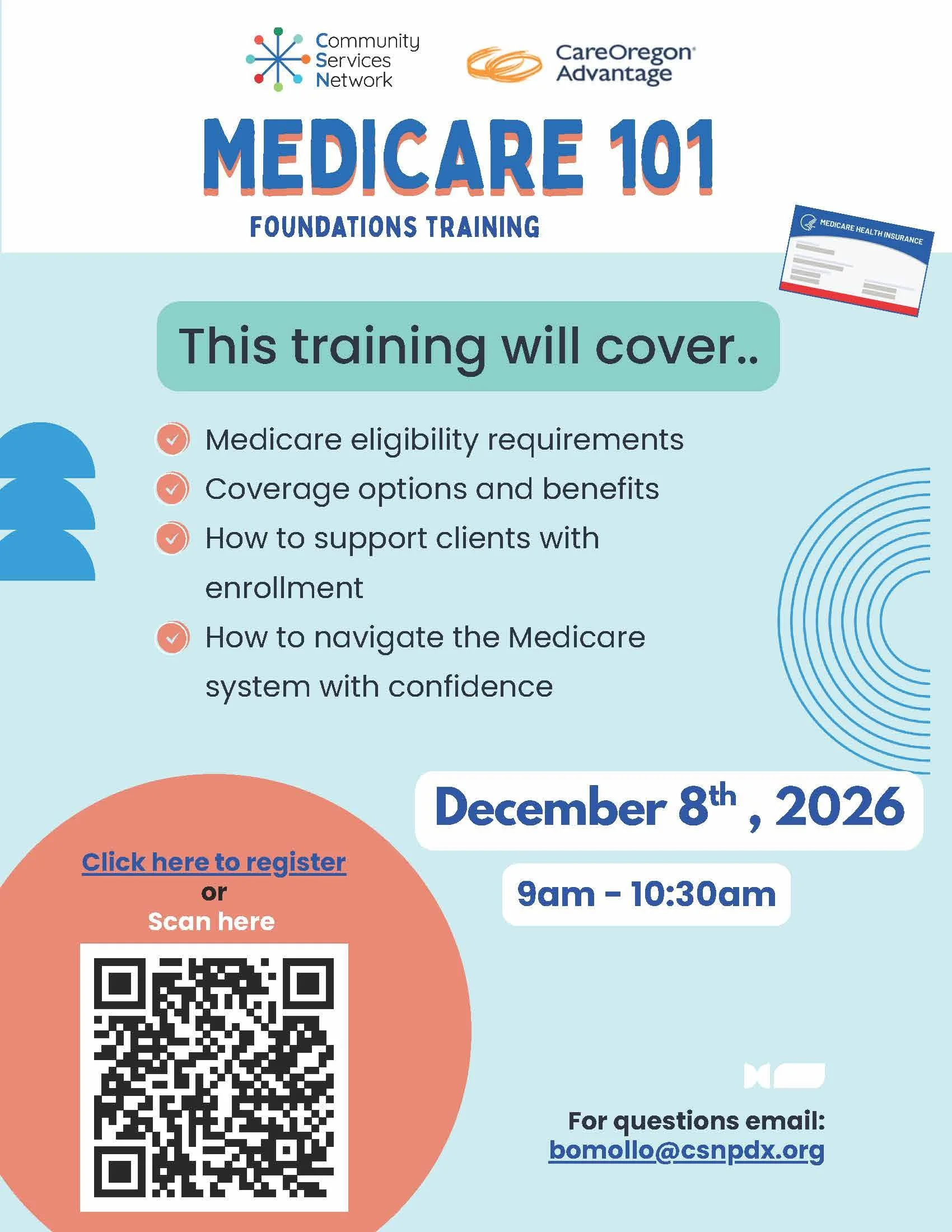 We’re excited to launch Medicare 101, a virtual workshop series created in collaboration between the Community Services Network (CSN) and CareOregon’s Medicare Advantage Team.