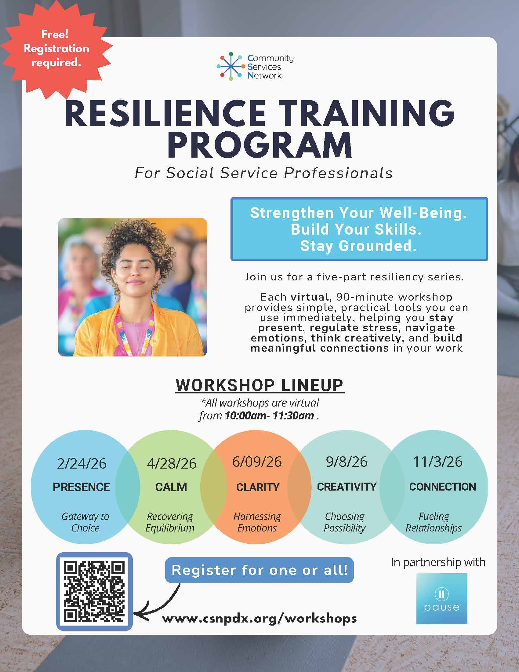 This year CSN, CareOregon and Pause are bringing you a five-part resiliency series, aimed at strengthening resilience among our social service professionals. Throughout the course of this series you will learn skills to help manage stress, prevent burnout, and sustain effectiveness in high-pressure environments. Each session will cover a different topic, here's what you can expect: