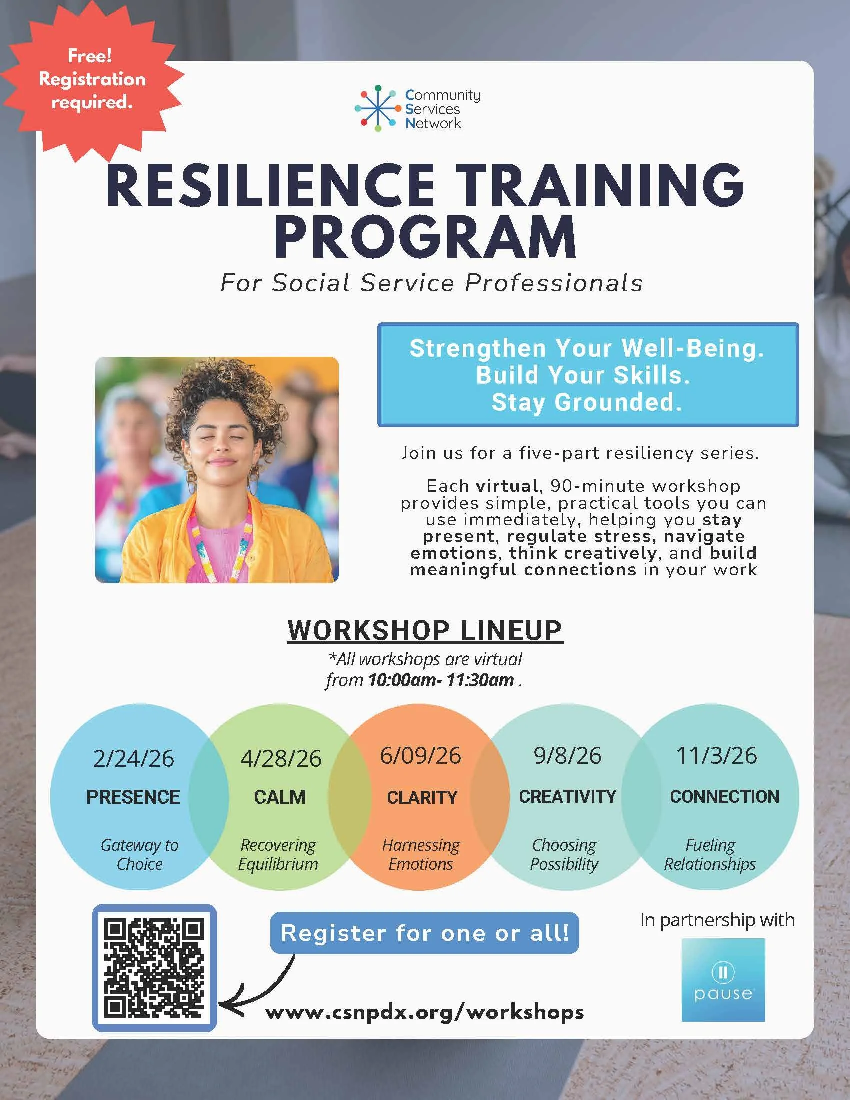 This year CSN, CareOregon and Pause are bringing you a five-part resiliency series, aimed at strengthening resilience among our social service professionals. Throughout the course of this series you will learn skills to help manage stress, prevent burnout, and sustain effectiveness in high-pressure environments. Each session will cover a different topic, here's what you can expect: